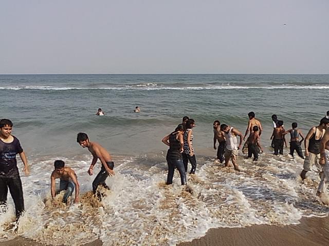 At first everyone was scared to enter the sea . Soon we were in our shorts and we were ready to enter inside the sea.The waves were roaring and getting higher. However, still the sun was bright in the sky and sand was cold .