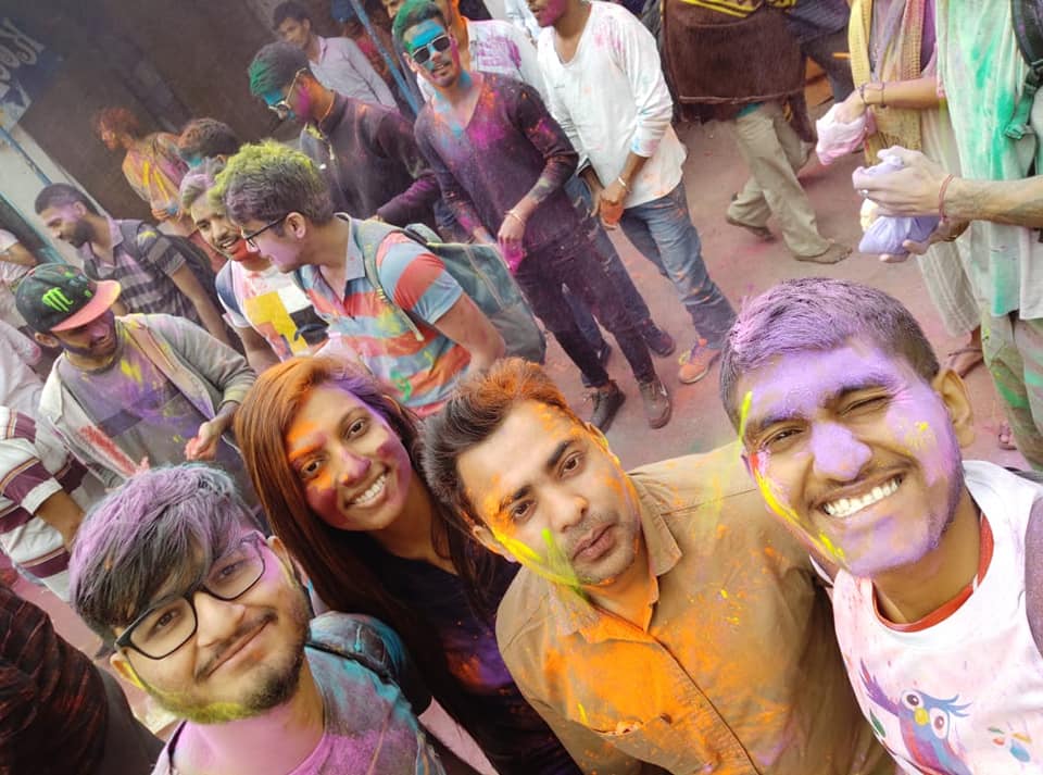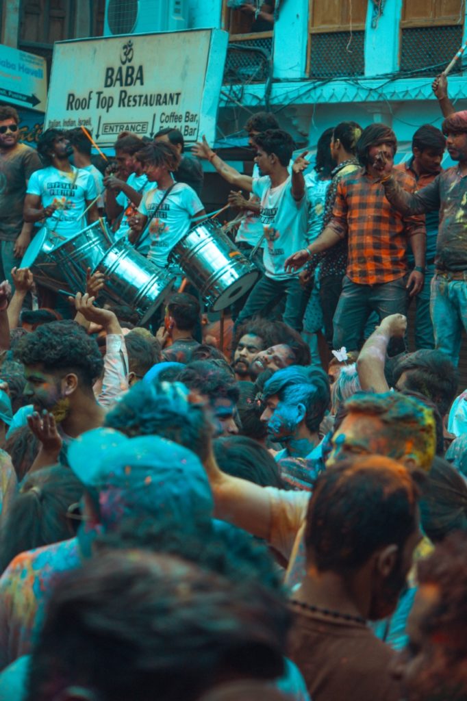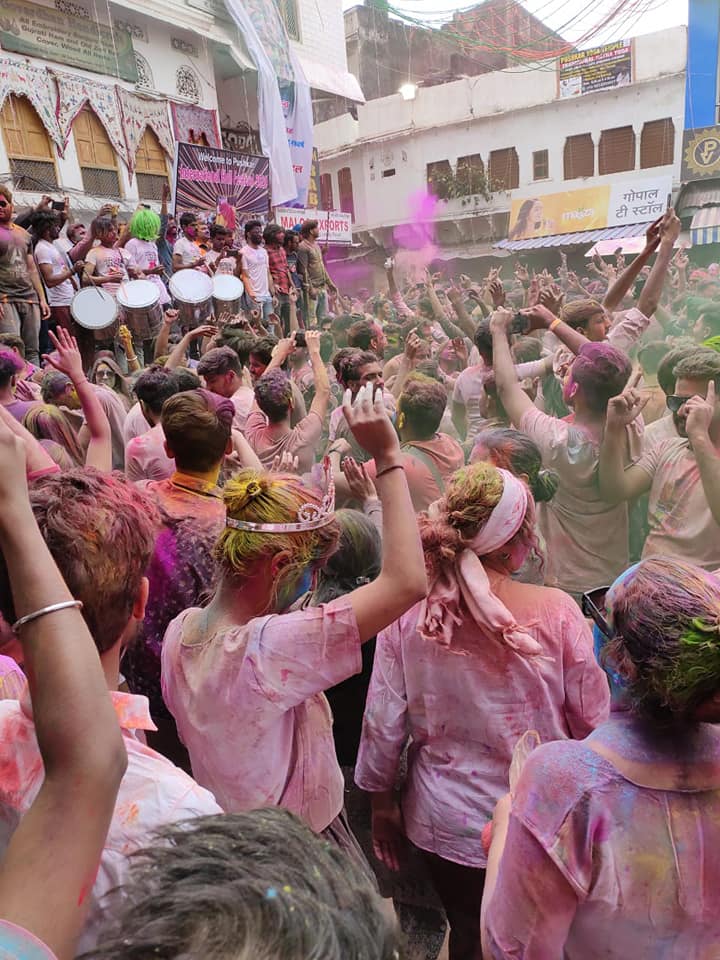 At a least a thousand people, completely covered in shades of blues, pinks, greens, reds and yellows,were dancing freely and madly about to the heavy beats of… electronic music and Dhol. Not what we expected at all.In the widest part of the street, revelers young and old, locals and tourists laughing, jumping, hugging, smearing, spraying, and splashing each other with dry and wet powder.